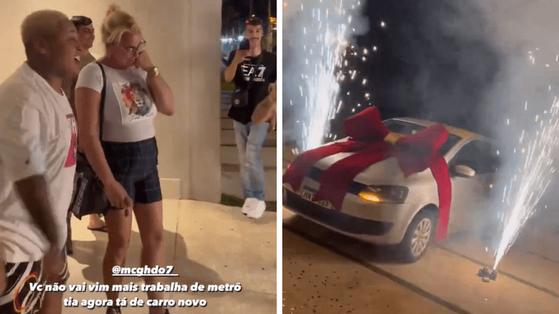 O funkeiro paulista deu um carro novo da Volkswagen para a zeladora de sua casa. “Você não vai mais vir trabalhar de metrô, tia. Agora tá de carro novo”, escreveu ele. No vídeo publicado, aparece saindo com a trabalhadora e mostrando a sua surpresa, com direito a laço vermelho e faísca no veículo.
