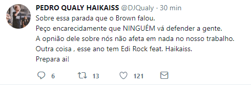 Sobre essa parada que o Brown falou. Peço encarecidamente que NINGUÉM vá defender a gente. A opinião dele sobre nós não afeta em nada no nosso trabalho. Outra coisa , esse ano tem Edi Rock feat. Haikaiss. Prepara ai!
